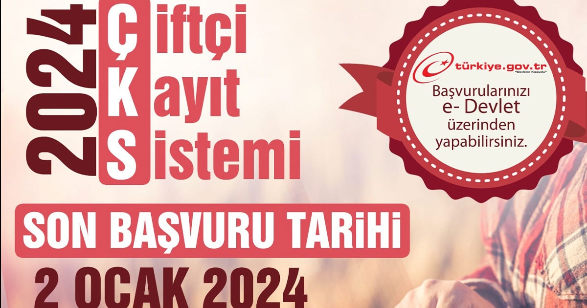Üreticilere ait tarımsal faaliyetlerin ülke genelinde kayıt altına alınması ve çiftçilerin desteklerden yararlanabilmeleri amacıyla Tarım ve Orman Bakanlığınca oluşturulan Çiftçi Kayıt Sistemi (ÇKS) için 2024 üretim yılı başvuruları 2 Ocak 2024 Salı günü sona eriyor. 1 Eylül 2023 tarihinde başlayan 2024 üretim yılına ilişkin ÇKS başvuruları, hem il/ilçe müdürlüklerince hem de e-Devlet kapısı üzerinden alınıyor.