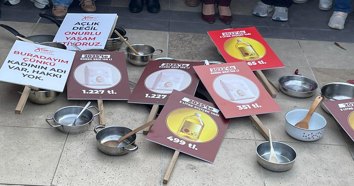 Yürüyüş sırasında “Boş tencere kaynamaz” ve “Bu düzeni kadın yıkmazsa hiç yıkılmaz” yazılı pankartlar taşıyan kadınlar, “Sabır taşıyor, tencere kaynamıyor” ve “Yoksulluğa Teslim Olmayacağız” sloganları attı.