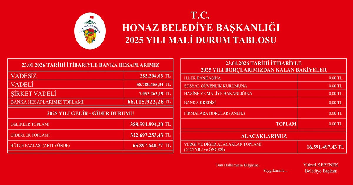 Her yılsonunda belediye bütçesini afiş yaparak idare binasına astıran Honaz Belediye Başkanı Kepenek geleneği bozmadı. Honaz Belediyesi 2026’ya sıfır borçla ve kasasında 65,8 milyon nakit ve 16,5 milyon alacakla girdi.